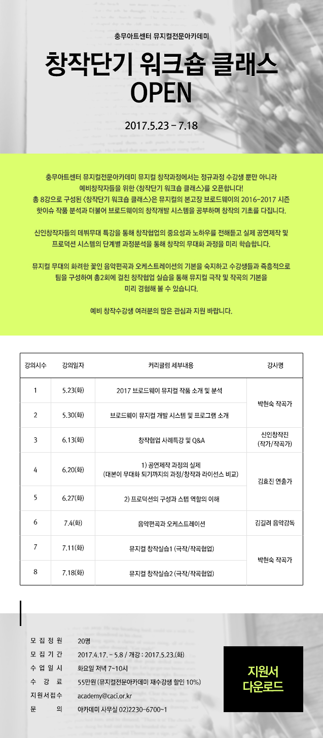 [기타예능학원] [충무아트센터 뮤지컬전문아카데미] ‘창작단기 워크숍 클래스’ 수강생 모집