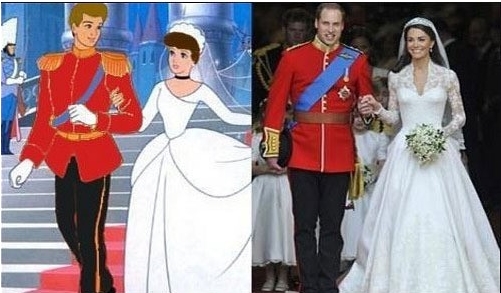 첫 번째 사진은 디즈니 애니메이션 '신데렐라'의 한 장면이고 두 번째 사진은 실제 영국 왕손 부부의 결혼식 모습이다.