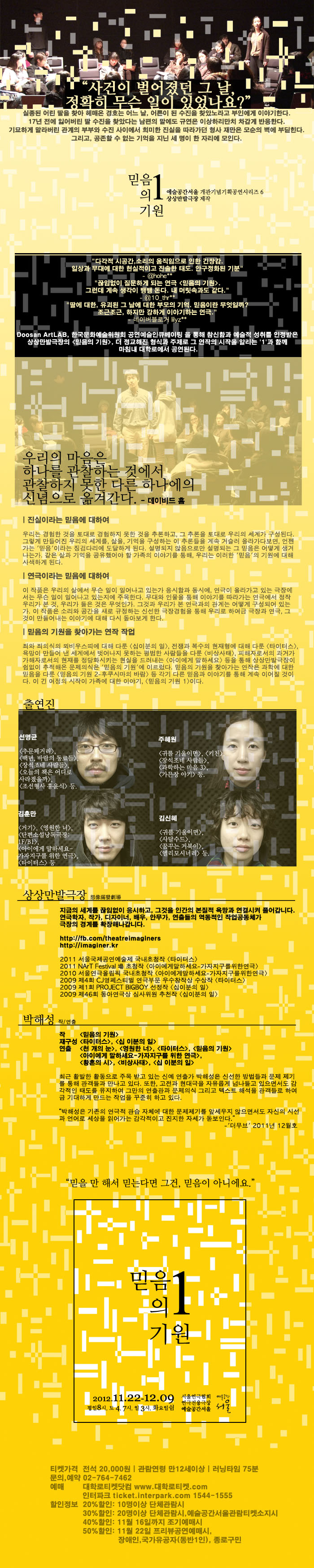 "믿음의 기원 1" (부제:믿을만해서 믿는다면, 그건 믿음이 아니에요 작,연출:박해성 출연:선명균, 주혜원, 김훈만, 홍미진 제작:극단 상상만발극장 극장:홍익대 대학로 아트센터 소극장 별점:★☆☆☆☆) 예약을 할 땐 몰랐는데 극장에 도착하여 전시된 사진을 보고, 이 공연을 작년에 예술공간 서울 에서 봤던 기억이 났다. 그만큼 기억에 남지 않았던 작품이었다는 얘기인가? 무대위에 의자를 설치하고 배우가 바로 옆을 걸어 다니면서 연기를 한다. 17년전에 잃어버린 딸을 찾는 남편과 진실을 따라가던 형사의 얘기이다. 여전히 이해하기가 어렵고 집중하기가 힘들었다. 1시간도 안되는 공연시간이 지루했다.