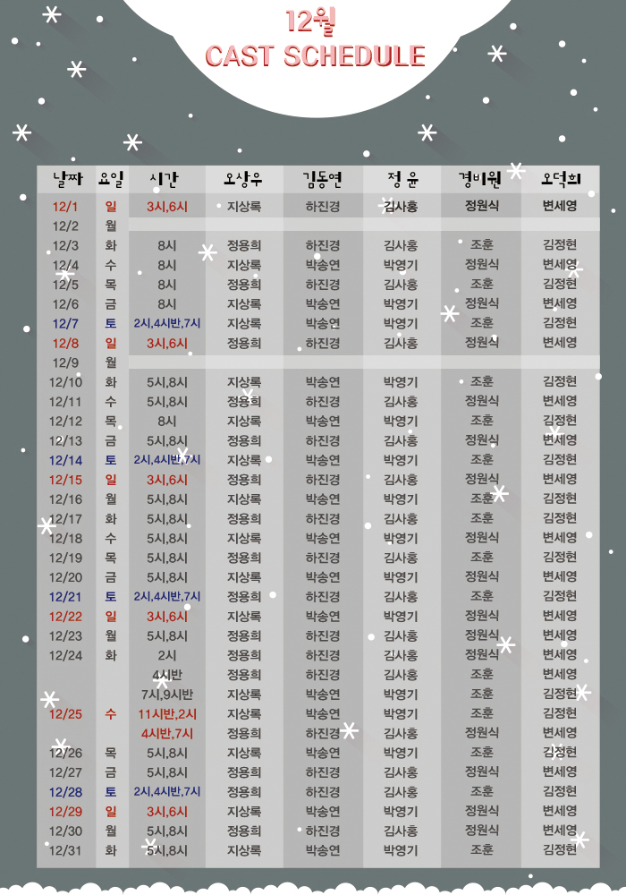 월 5시 / 화~금 5시, 8시 / 토 2시, 4시30분, 7시 / 일,공휴일 3시, 6시 |