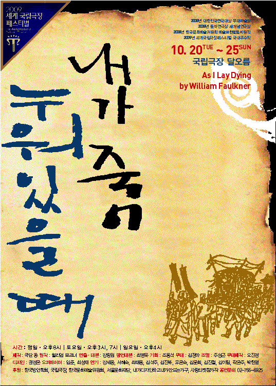 세계 각국의 대표 급 공연들을 초청하여 각 나라의 공연문화의 특징과 그 속에 담긴 보편성을 교류하기 위해 기획된 세계 국립극장 페스티발에 <내가 죽어 누워있을 때>가 국내 참가 작품으로 선정되어 공연된다!
