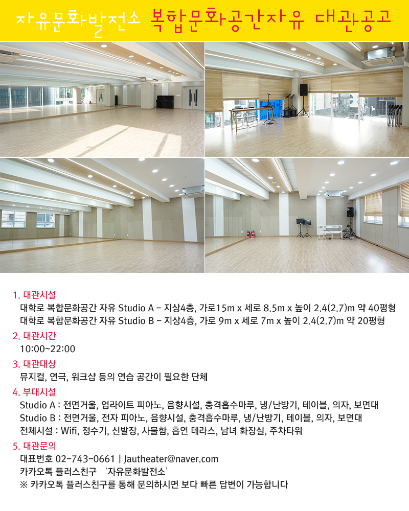 [자유문화발전소] 혜화역 도보 3분 지상연습실 /대학로 자유연습실 / (STUDIO A 5월 1일 ~ 13일 / STUDIO B 5월 ~ )