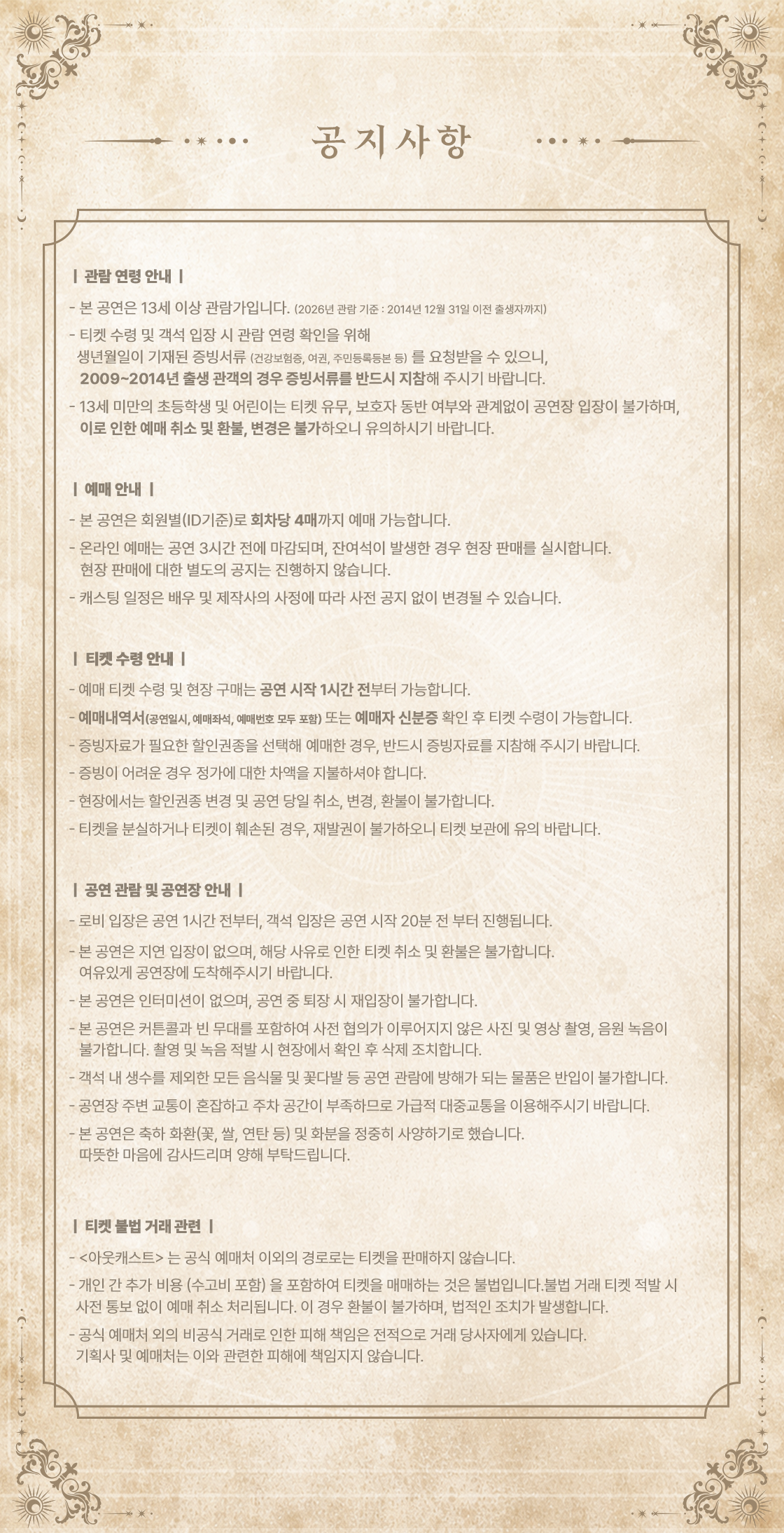 화요일(20:00), 수요일(20:00), 목요일(16:00,20:00), 금요일(20:00), 토요일(15:00,19:00), 일요일(14:00,18:00), HOL(14:00,18:00)
